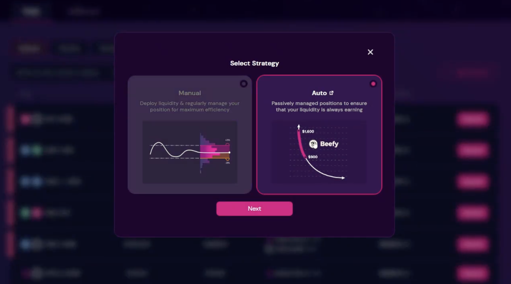 Once you've clicked on a pool, select the "Auto" strategy. Auto vaults manages your LP positions for you so you're always earning (never go out-of-range), and it is run by **Beefy**, the leading ALM in DeFi.