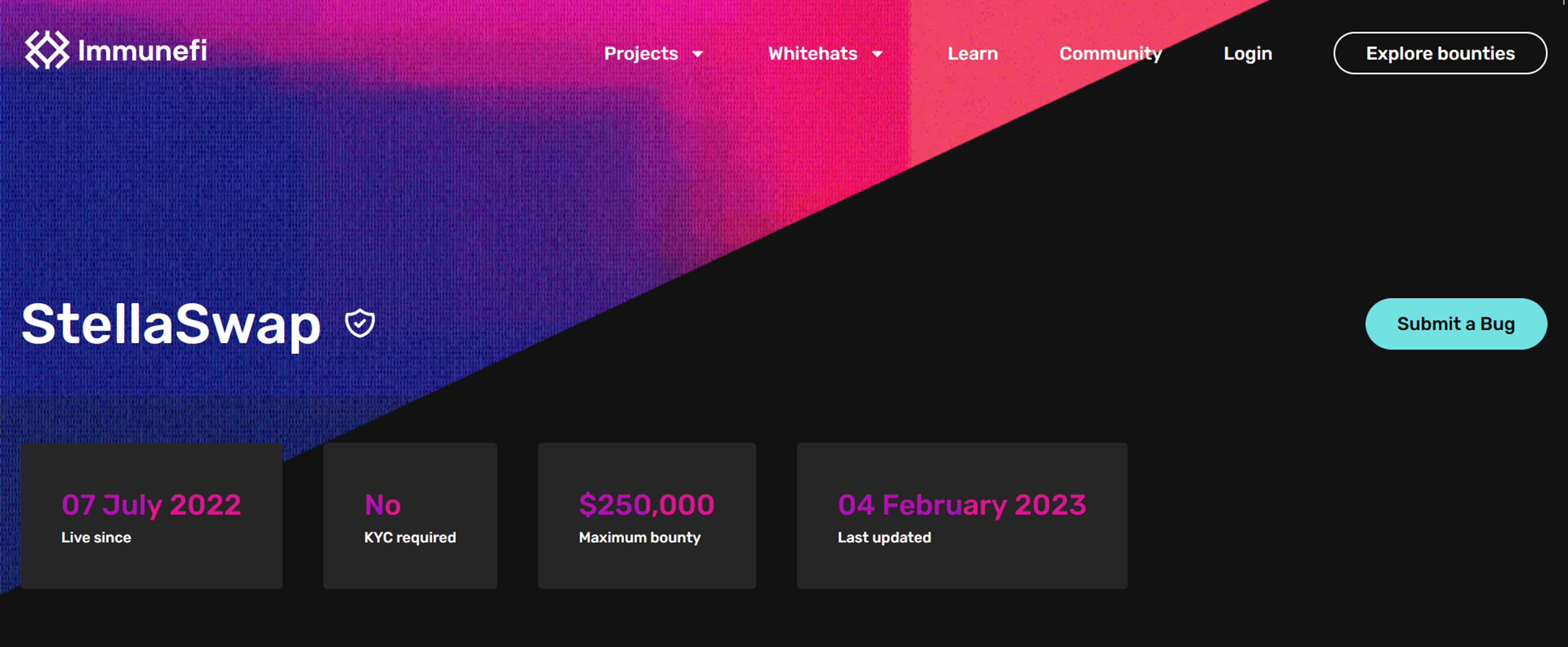 In order to continually foster greater security oversight, StellaSwap has an active bug bounty program on ImmuneFi, Web3's leading bug bounty platform. We're proud of the fact that we have one of the largest bug bounty across Polkadot & Moonbeam. Our commitment to security is the highest priority.